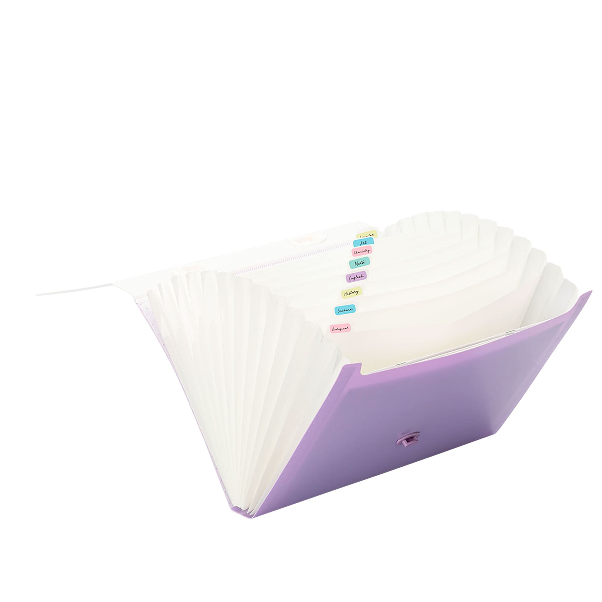 Esta carpeta expandible en colores pastel, es ideal para clasificar y guardar documentos de manera ordenada y segura, cuenta con 13 compartimientos y una hoja de stickers con pestañas