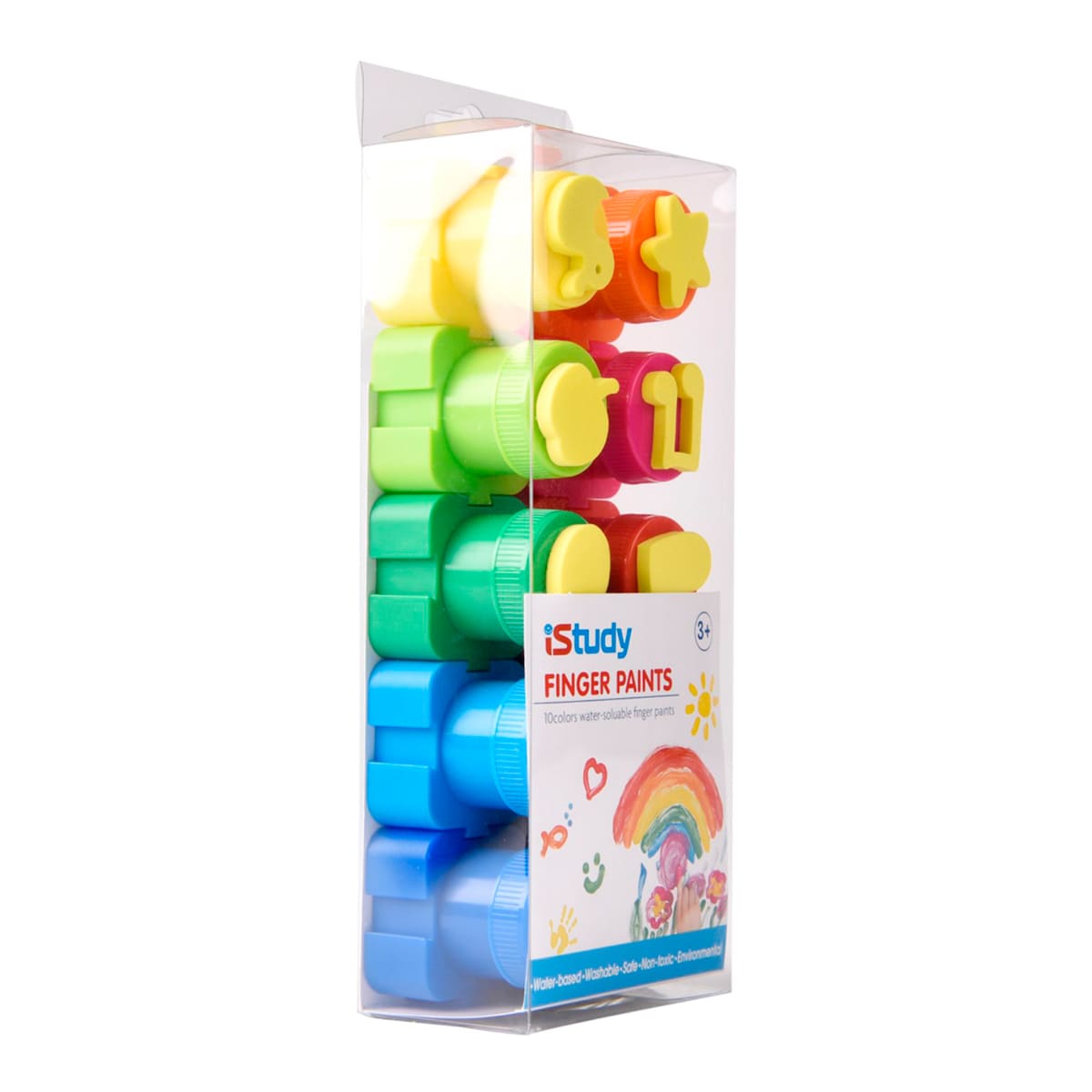 Las pinturas para dedos iStudy incluyen 10 colores, cada una cuenta con un diseño de sello en la tapa para poder utilizar con las pinturas. Son fáciles de utilizar y lavar de las manos.